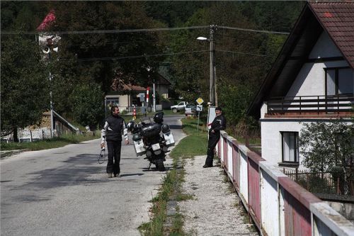 Noční přechod studené fronty znamená, že v tuhle chvíli je teplota minimálně o deset, ne-li více stupňů nižší, nežli ještě včera. Vyjel jsem optimisticky (a chybně) v džínech, a tak docela uvítám první čurpauzu s tím, že provedu bleskurychlou náhradu džín za regulérní motokaťata. Ta se zatím celou dovolenou vezla v báglu, až nyní na ně přišla řada.