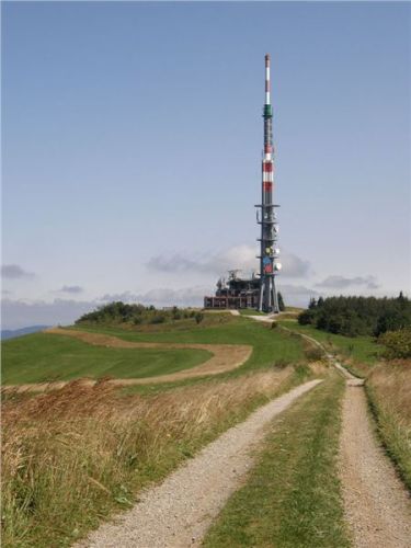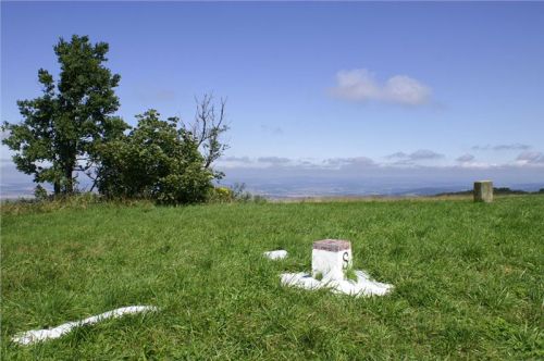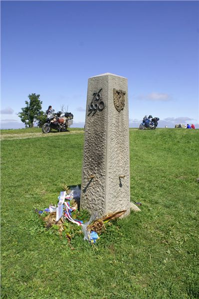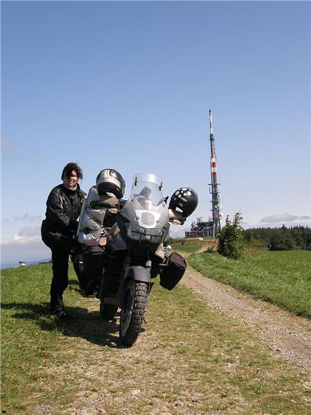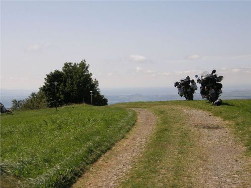Průzkum u chaty na slovenské straně nám usnadní skutečnost, že proti nám na hřebenové cestě jede auto, tedy evidentně je sjízdno a můžeme se na ni vydat. Cesta je to klasická makadamová, tedy pro naše stroje sjízdná bez jakýchkoliv problémů. Vyhrabeme se na hřeben a pokračujeme po něm kousek až k mohyle (GPS: N48 51 16.8 E17 40 08.8), kde odstavíme motorky na kraji cesty a uděláme si zde hřebenovou přestávečku.