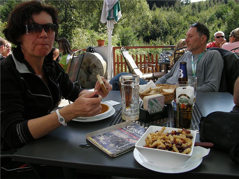 Zbytek vejpravy doženu před parkovištěm Kamenná Bouda, kde odbočíme vlevo po vrstevnici. Tato odbočka se však projeví jako slepá, tedy se vrátíme a sjedeme až přímo ke Kamenné Boudě, kde teprve je ta správná odbočka. Silnička po traverzu do strmého údolí Černého potoka získá i asfalt, takže se klikatícími zatáčkami jede dolů fajn. Cesta nás vyplivne do osady Vápenky. Už je kolem druhé, takže jakmile uvidíme hospůdku, stavíme a pronikáme dovnitř s úmyslem se nadlábnout.