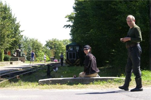 R: Jak trefně poznamenala Jana, naše motocyklistická skupinka vytvořila kolem odjíždějící soupravy celkem slušný šotoušský frmol :-). A to se o vlaky v podstatě zajímáme jen my dva s Jirkou, nicméně fotil každý, kdo měl ruce a foťák. Ovšem nikdo jiný, jen my, takže po nás ostatní (vesměs místní) nejistě pokukovali, na tvářích udivené výrazy, jestli snad nevíme něco, co oni ne.