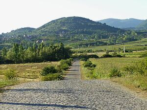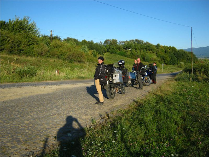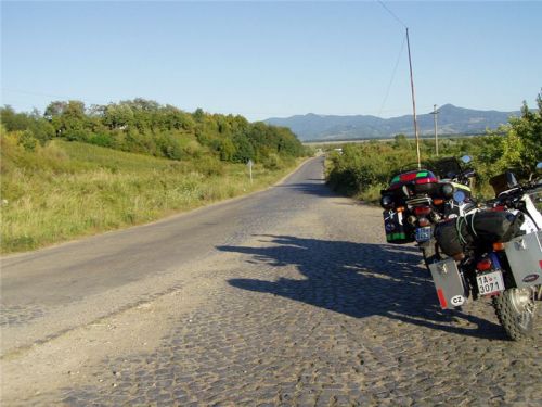 Silnice definitivně nabývá rumunských parametrů, tedy zaplaťbůh za cestovní endura, a i ty se zde rozhodně nemohou flákat .... Tak si hrkáme sotva čtyřicítkou, ukoptěni prachem a vedrem, vymetáme výmoly, které plynule navazují jeden na druhý, kolem nás bují vlkodlašská realita. Zastavíme na malou přestávečku, protože Honzu fotografa zaujme motiv pravěké silnice, slunce zvolna zapadajícího do zaprášeného údolí a rustikální kozí farmy vedle cesty.