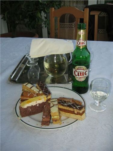 Prý aby se nám zkrátilo čekání :-). No, po zákuscích se jen zapráší (bejt tady paní dochtor, zaprášilo by se daleko rychleji) a tuice se také brzy mrkneme na dno. Slušné pití, něco jako naše slivovice, ale zřejmě se pálí z ovoce směsného a co právě jest, aromatičtější než je u nás.