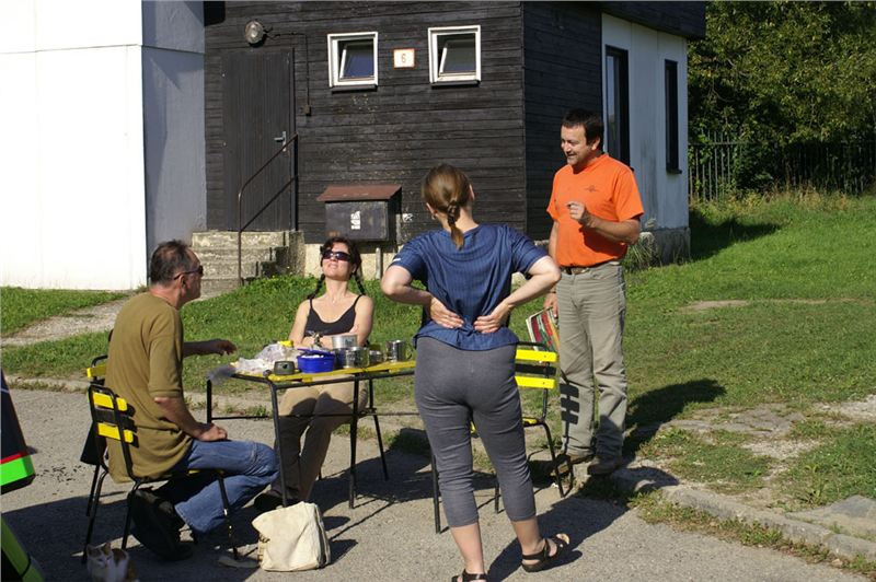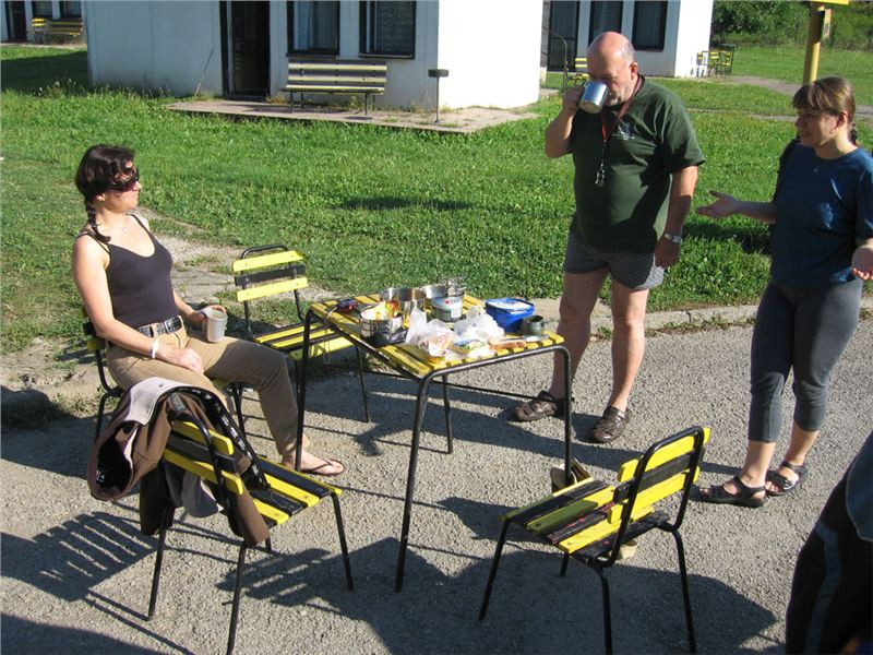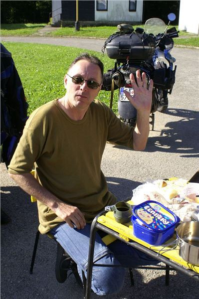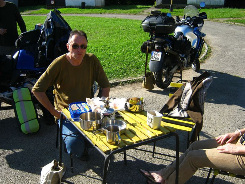 Snídani dáme pod klenbou probouzejícího se překrásného dne. Stolek, židličky, každý baští, co vezeno jím. Osobně přecházím na minimální dovolenkový simple stravovací mód, tedy vepřové ve vlastní šťávě plus chléb český. Na to tatranka, vše zalito kvantem poctivého englického tea. Žádný instantní blivaniny :-).