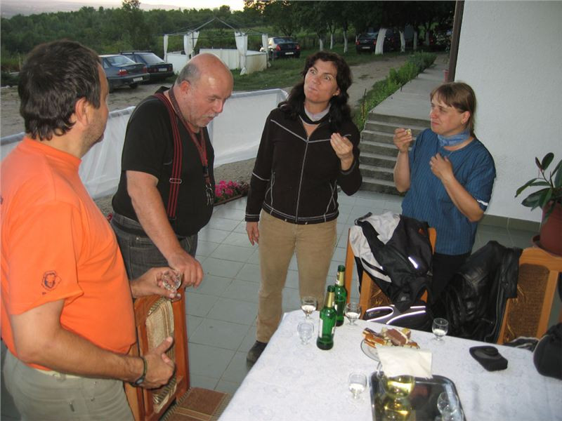 Zvolna vychládáme na venkovní verandě, zavazadla připravená, až bude na cimrách volno. Hodnotíme den a zážitky, když tu nás vyruší starší pán, přinášející tác se zákusky (zřejmě pozůstatek svatebního pohoštění) a karafu s místní pálenkou „cujkou“ (píše se „tuica“)