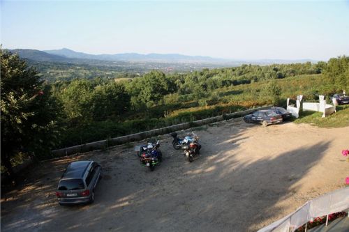 Když trochu vychladneme, popojedeme do kopce až k bráně do kláštera, kde již parkuje několik motorek.