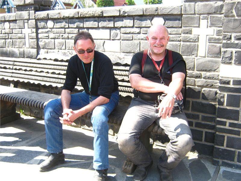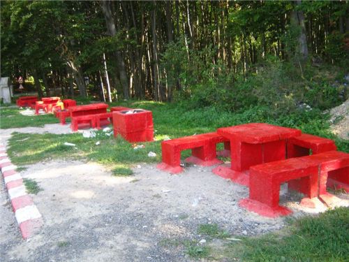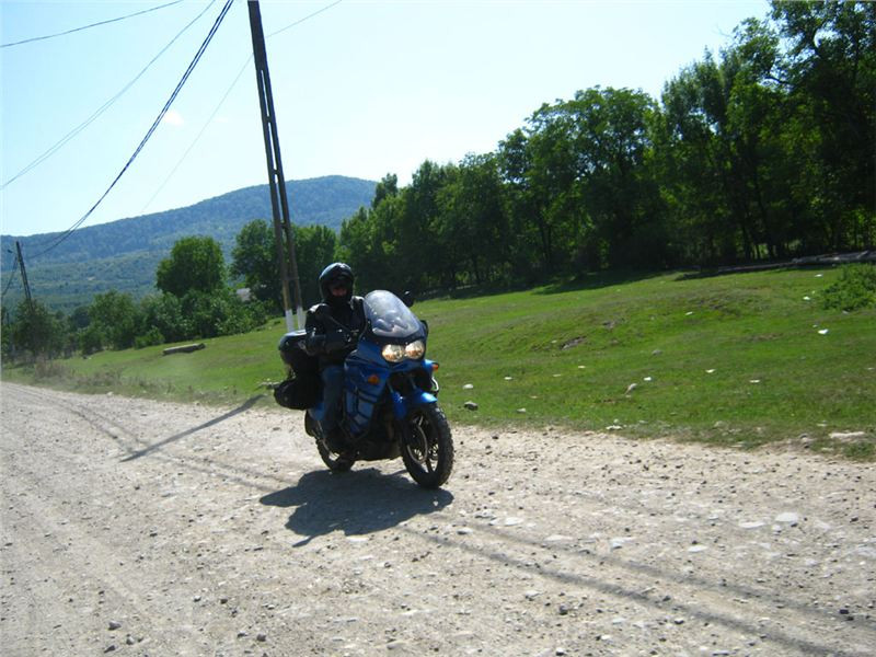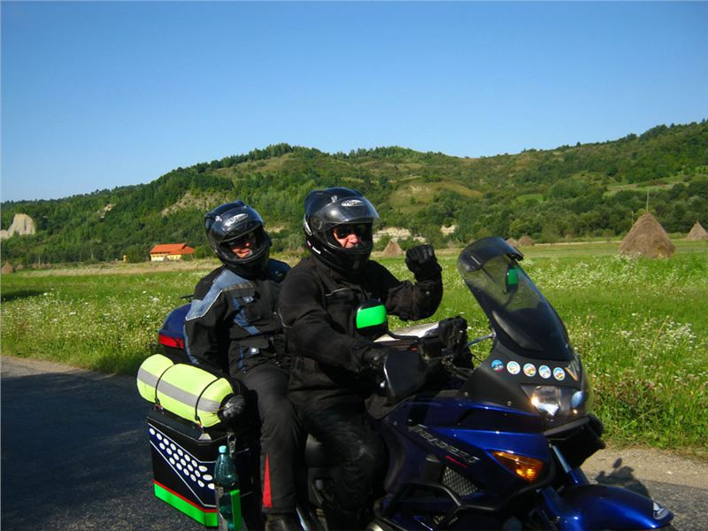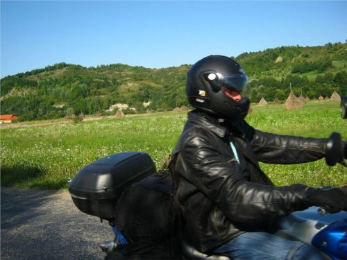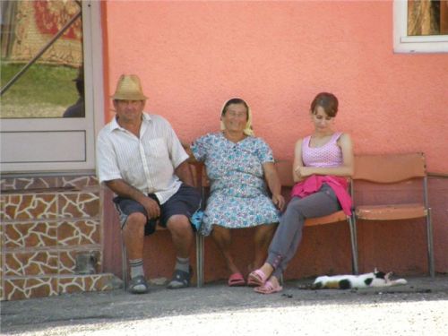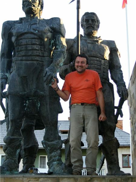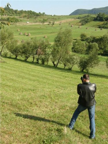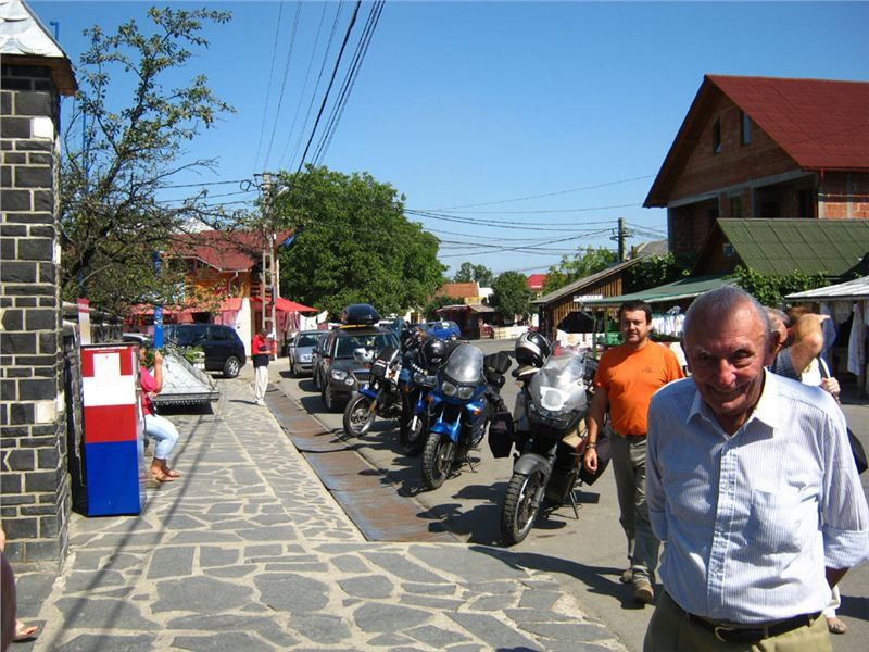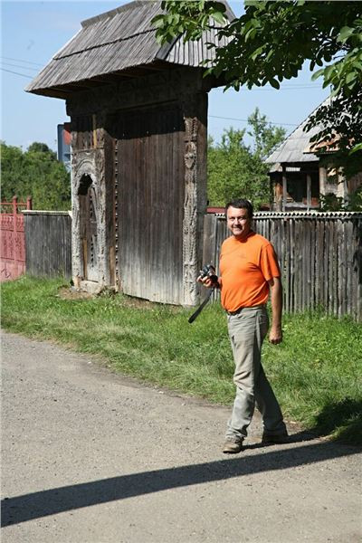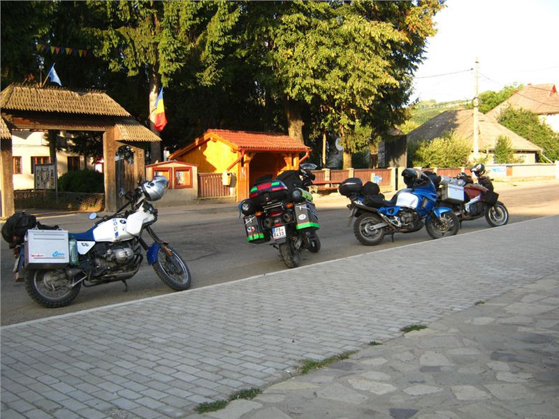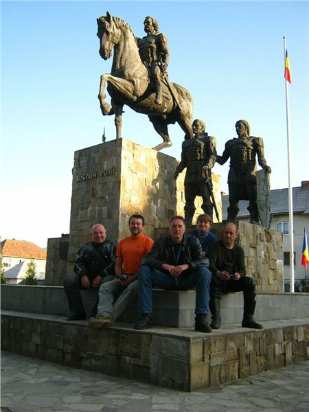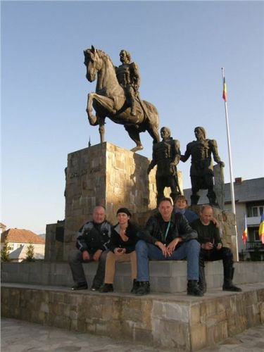 Ale nic, konec historických reminiscencí :-). Očíhneme okolí, v podvečer to tady, stejně jako ve všech rumunských obcích, žije bohatým společenským životem. Halt tady ještě lidi žijou sousedsky a družně, ne jako v podobných obcích u nás či od nás na západ, kdy soumrak pozvolna zahaluje vylidněné ulice, ozářené pouze modravými přísvity TV obrazovek zpoza oken zabedněných baráků. Alespoň že se u nás sem tam vyskytne družný potácející se opilec :-). Ještě závěrečná fotka s Bogdanem Prvním a jeho drsnou družinou a mažeme dál. Pomalu začíná zapadat slunce a my ještě nebydlíme....