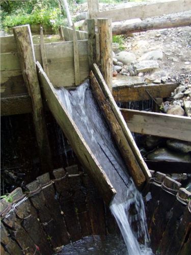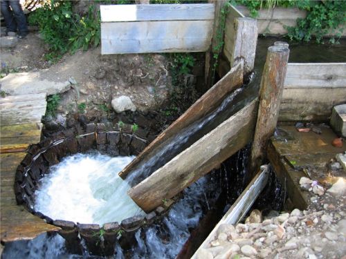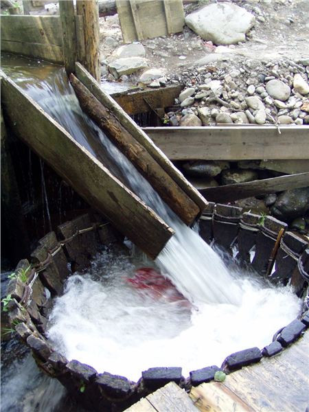 Technicky vzato, jedná se o velmi zajímavé a prajednoduché využití vodního proudu. Ten je stavidlem s hradítky přiveden nad dřevěný trychtýřovitý koš, zcela záměrně s mezerami mezi jednotlivými prkny. Šikmo přivedený vtok vytváří mohutný vír, ve kterém se vhozená textilie sama od sebe pere a pere a pere, dokud ji pradlena zahnutým klackem nevytáhne. Jasně, není to na praní fuseklí, slip či tang, ty by hnedle zmizely dále po proudu. Ale třeba halena či kaťata už mezerami neprojdou :-).