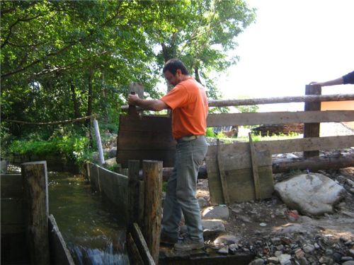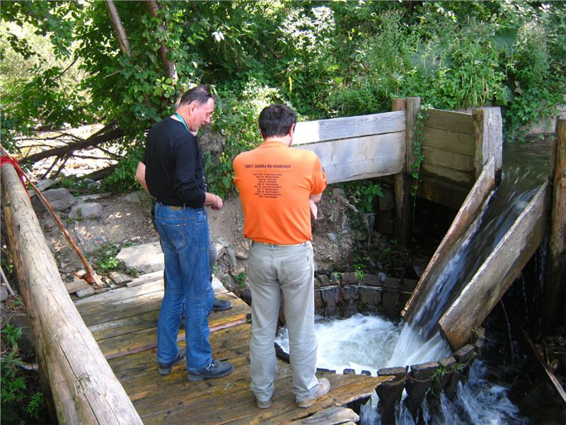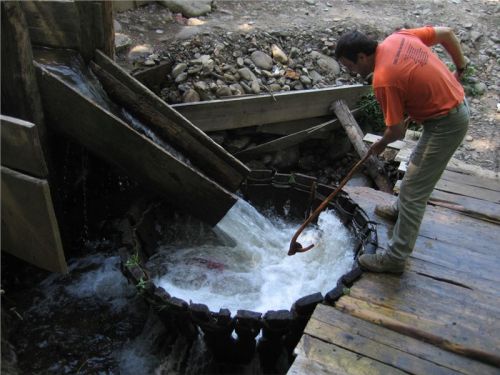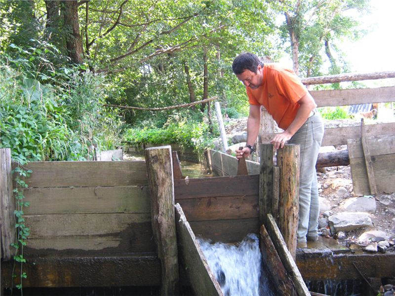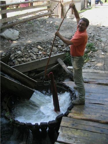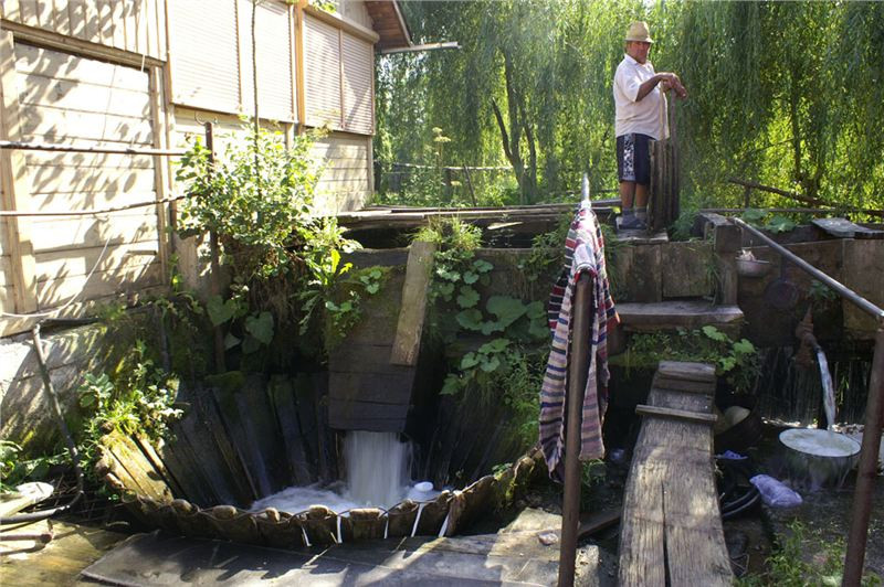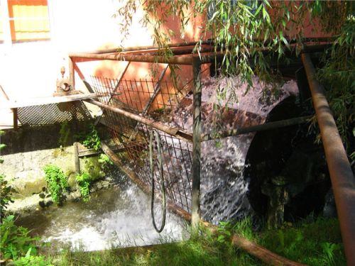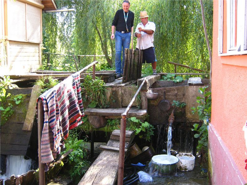 Náš příjezd donutil majitele k vykouknutí ze svého hájenství, zřejmě potěšen zájmem podivných cizinců nabízí nejen prohlídku mlýna, ale dokonce se chystá jej na chvilku a jen pro nás spustit. Postupně (místa tu moc nejni) prolezeme jak přívodní vantroky, tak i mlýnské kolo a vnitřek malé mlýnice. Mlejn je to poměrně malý, takříkajíc příruční, oproti u nás známým a obvyklým velkým mlýnům. Asi chudší kraj, menší mlejn. Koneckonců, ani vodní zdroj není nikterak mocný, zdejším mlynářům ale očividně postačoval.