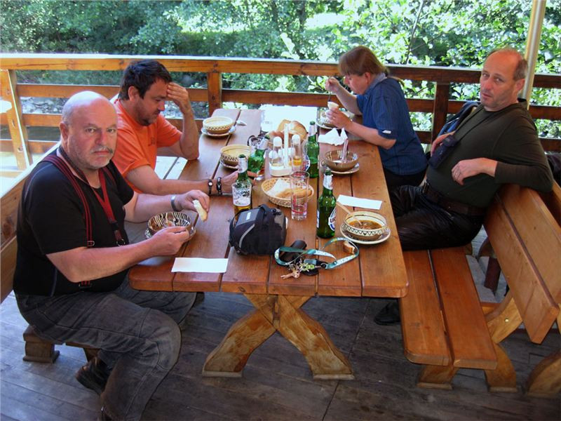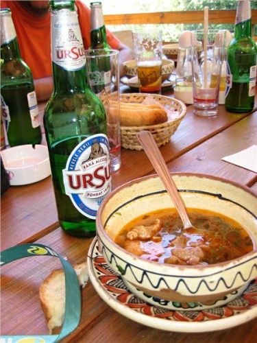 Rozložíme se u jednoho stolu. Nabídka jídel je více než slušná, díky vedru ale dáváme jen nealko piva Ursus zdejší provenience (velmi dobrá, asi že chladná :-))) a pak si každý objednáme nějakou místní polévku (ciorbă). Zjistili jsme, že porce jsou více než vydatné a chuťově vynikající, ať už si člověk objednal jakoukoliv. Někdo má místní bílou variantu dršťkové (burta), hovězí se zeleninou
