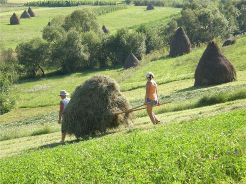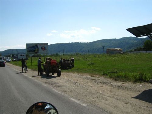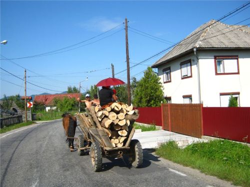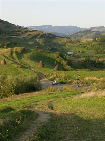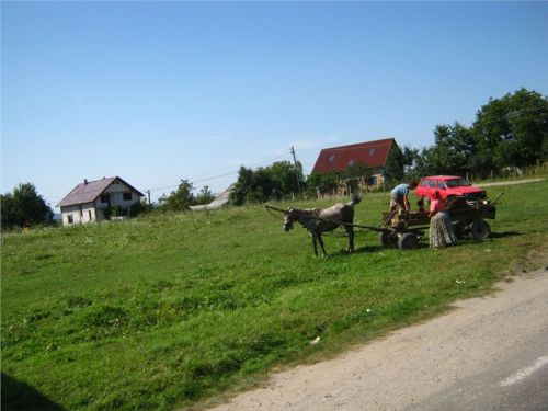Tak dál... Naštěstí po chvilce jízdy napadne vedoucí dvojici odchytit místního informátora. Tím se stane starší pár na valníku s dvěma koňskými silami. Jako „Karlík na ocase“ z nastalé diskuze nepochytím skoro nic, ale nějak se jim podaří (klobouk dolů) zjistit, že hledaný mlejn je na odbočce na Călinesti. Ta je kousek před nám, tak se nebojíme ji použít :-).