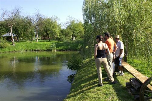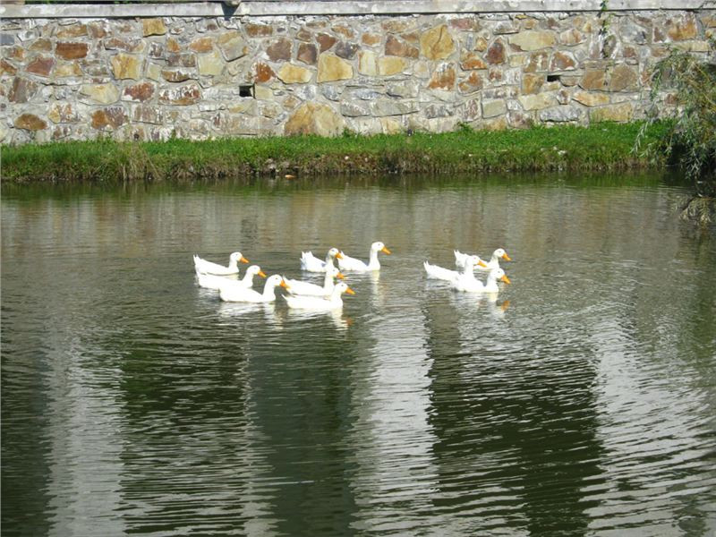 Chvilku si ještě odfrkneme na břehu malého rybníčka, kde nám pan majitel předvede nejenom hlasové ovládání hejna husí, ale i krmení slušných rybích macků zrním.