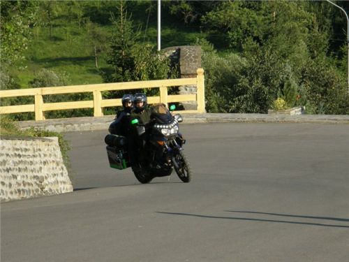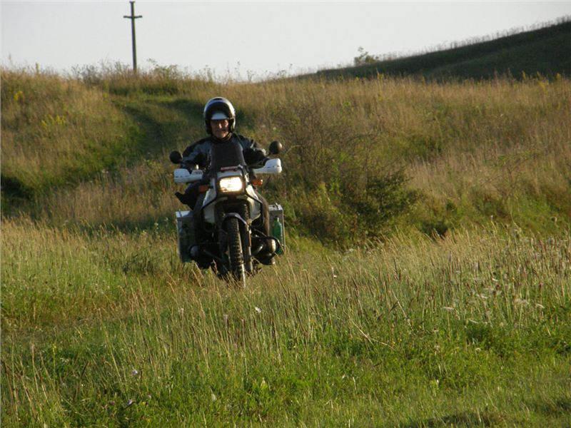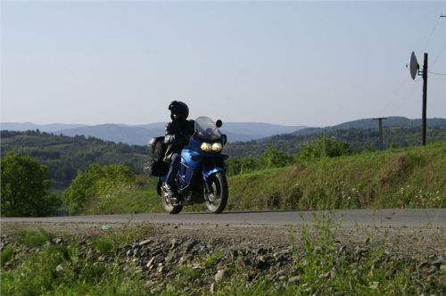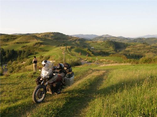 Přejedu hřbet, minu partičku mlaďasů, kteří si u ohníčku piknikují, další stoupání a hřbet, stavím. Tady už nikde nikdo, klid podvečera, lísteček se nehne, jen já, věrné GS a příroda. Okamžik, pro které se plahočím, pro které se harcuju na motorce někam ke všem čertům ďáblům, pro které prostě stojí za to žít a leccos podstoupit. Láká mne to jet po luční cestě za další obzory, za další vrchy, ale svědomiťák a přizdikakáč ve mně našeptává, bych neblbnul. Jsem sám, večer a tma na krku, ostatní čekají... Tak ještě chvilku postojím a vstřebávám atmosféru, ještě pár kroků na hřeben a něco fotek zapadajícím sluncem zajímavě vyrýsovaného okolí. Pak už nezbývá než se otočit a vrátit se zpět ke společníkům a civilizaci.