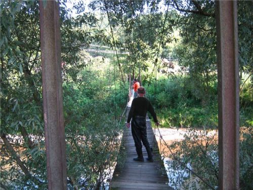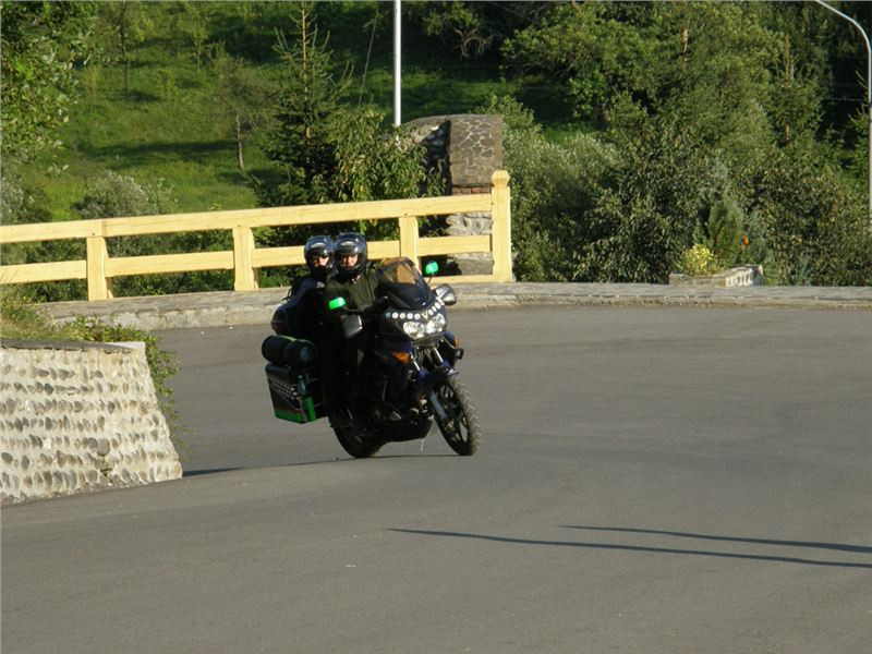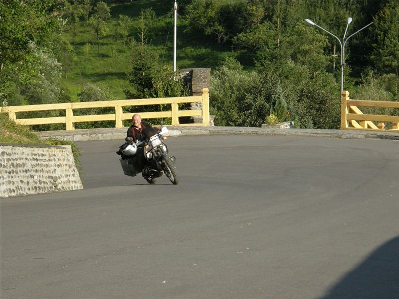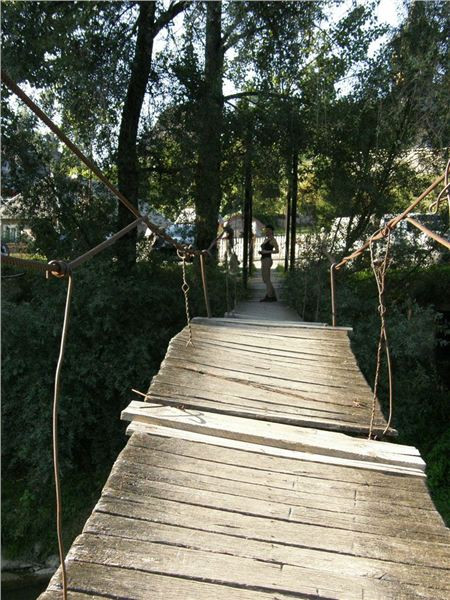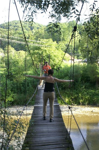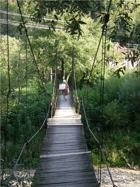 Naší prvotní snahou je ale podojit zdejší bankomat, neb někdo usuzuje, že má málo hotovosti a bylo by dobré se předzásobit. Poté pozornost kolektivu zaujme vedle visící závěsná lávka pro pěší přes řeku Iza. Já tyhle houpavý věci moc nemusím, Jana s Ranžou jsou ale lávkou nadšeni. Ještě se dohadujeme, zdali by se dala přeject na motorce, ale nikdo z nás si nelajskne praktický experiment.
