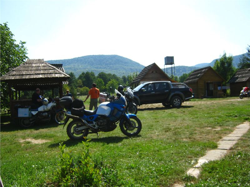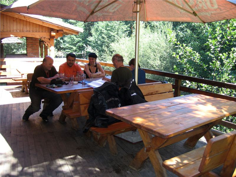 Konec času poznávání, je třeba taky uspokojit těla. Poodjedeme kousek na jižní okraj vsi, kde zahneme do Ranžou slíbeného kempíku s několika chatičkami a restaurací s mohutnou zastřešenou terasou nad bystřinou.
