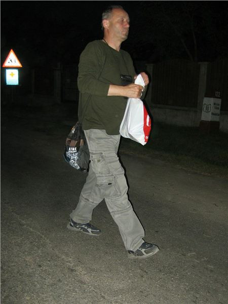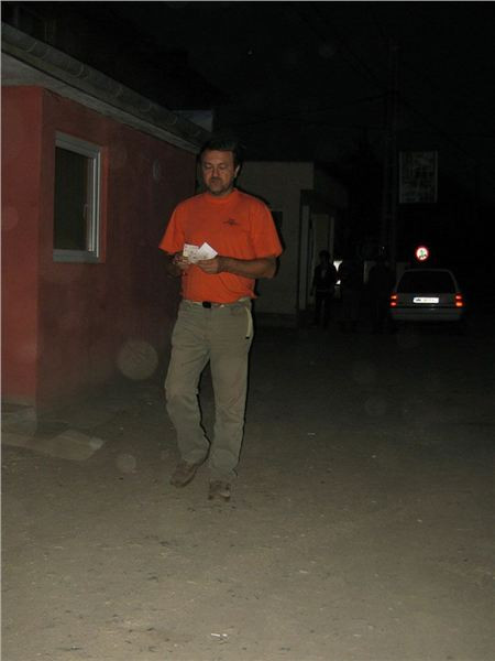 Už jsme skoro na odjezdu, když si všimneme dvou chlapíků, smýkajících do sálu padesátilitrový plastový barel čehosi. Za chvilku na mne Honza mává, prej abych ještě šel dovnitř. A je mi jasno – uvnitř to smrdí jako v pálenici a příčinou je stáčení cujky z barelu do petek. Slovo dá slovo, pozdravím se se stáčeči (jeden opět trochu umí anglicky) a zeptám se, zdali by nebylo možné si jednu petku koupit. Jo, prej klidně, akurát si musíme přinýst svoji. Honza jednu obětuje a už se plní. Nejprve nám ji nutí zadarmo – že prej jako svatební prezent, pak se po delším přemáhání spokojí s třicítkou RONů. 1,5 litru za 150,- Kč, dobrej byznys...
