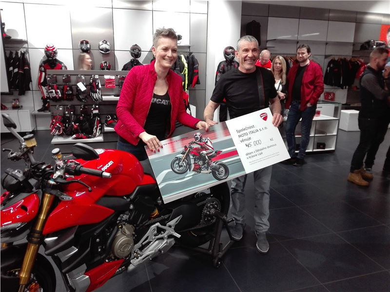 Milníků firmy bylo více a jedním zásadním i to, že se dlouhodobě české zastoupení značky Ducati věnuje charitě a při různých příležitostech aktivně získává peníze pro Dětský domov v Krásné Lípě u Rumburku, kam už poslali více než půl milionu korun. Stejně tomu bylo i na pondělním slavnostním otevření nové prodejny, kde se dražily tři repliky malovaných obrázků Ducati Panigale V4 R, které vlastnoručně podepsal výkonný ředitel továrny Ducati pan Claudio Domenicali.