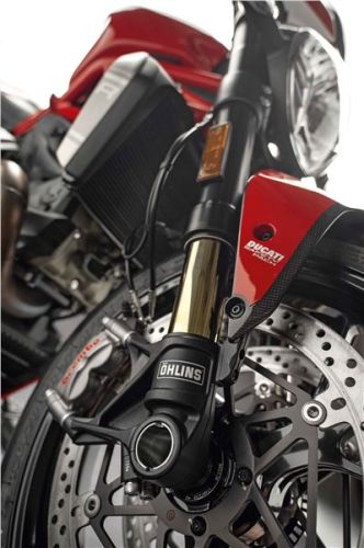 Ducati Monster R má tlumič řízení Öhlins a plně nastavitelné odpružení stejné značky, mnoho prvků z uhlíkových vláken a je cca o 2 kg lehčí než model S.