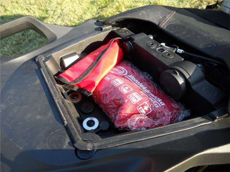 Potěšující je úložný prostor pod spolujezdcovým sedadlem s nářadíčkem, kde je umístěná i 5V USB a Euro 12V zásuvka. Jedna dvanáctivoltová zásuvka je taky vpředu, takže pokud potřebujete za jízdy něco napájet a nabíjet, nemusíte se omezovat.