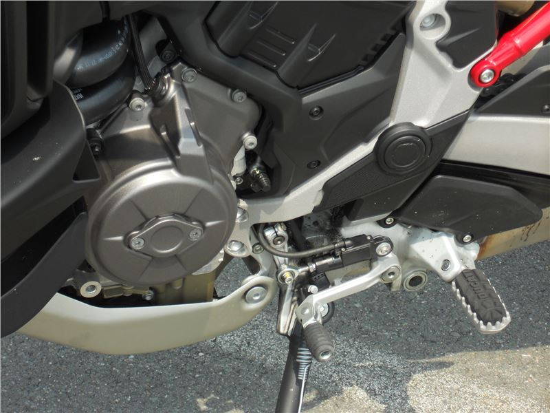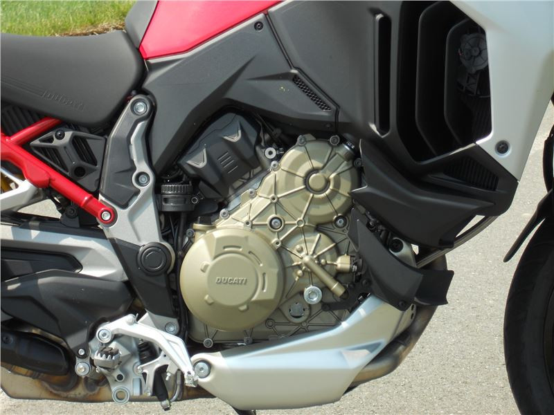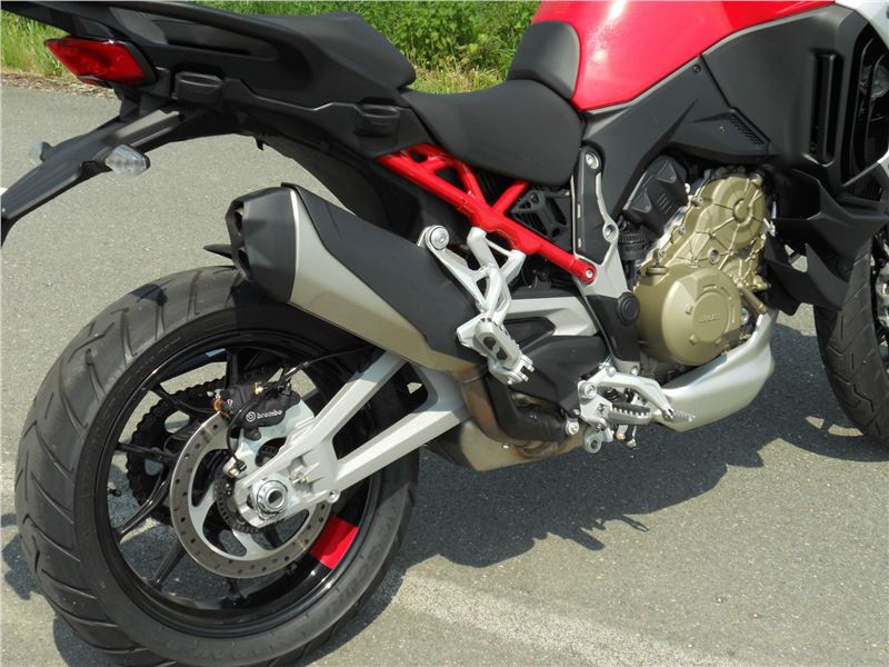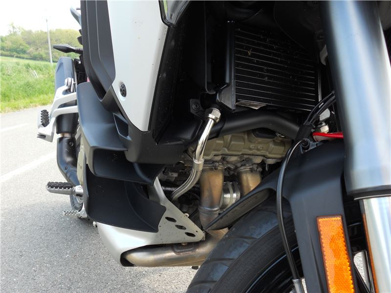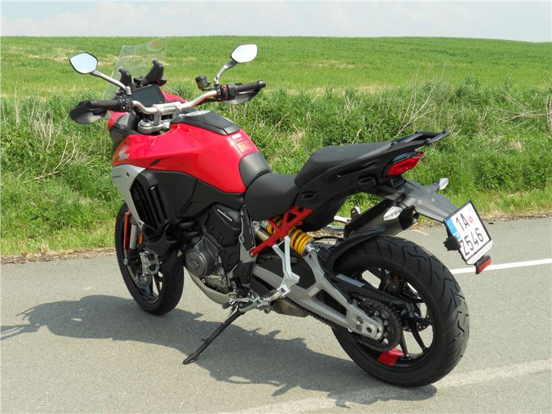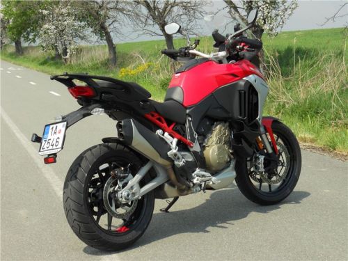 Co je překvapivě jinak proti původnímu dvouválci 1262 ccm je krouťák, snížený na 125 kW při 8 750 ot./min., což však agilitě V4 nijak neubírá. Nový motor je jen nepatrně lehčí než V-twin, je taky kratší, nižší a jen o 2 centimetry širší. Ve zcela novém rámu je motor umístěný výše, což má kladný vliv na světlou výšku 220 mm. Rozdíl je proti V-twinu 46 mm. A ten zvuk... Na křižovatce mezi baráky je to jako v koncertní síni, a to nemám příplatkový Akrapovič, který má ve standardu verze Sport. To by byl teprve "řev bestie".