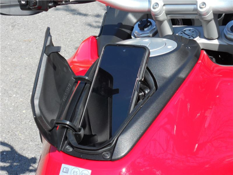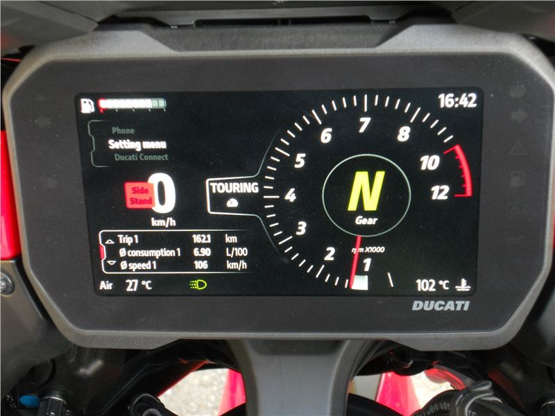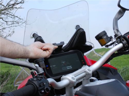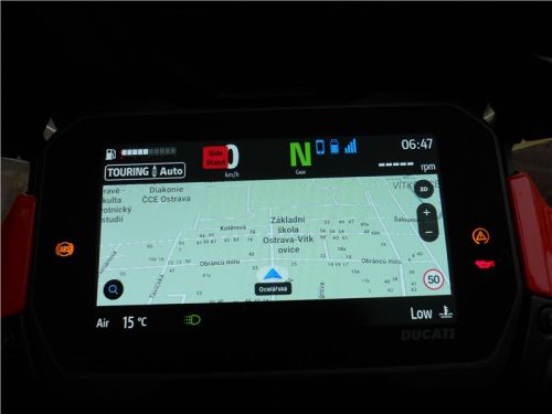 Když si do smartphone stáhnu appku Ducati Connect, TFT displej umí zrcadlit navigaci Sygic a telefonní hovory a další. Jde to docela snadno a všechno funguje na výbornou. Na displeji je vidět kdo mi volá, tak nemusím zastavovat a šmátrat po vibrujícím telefonu.