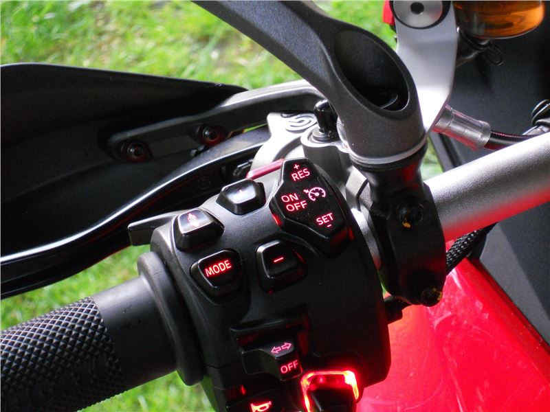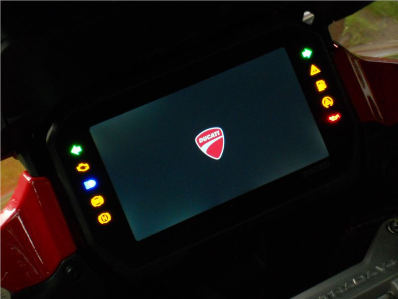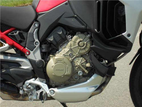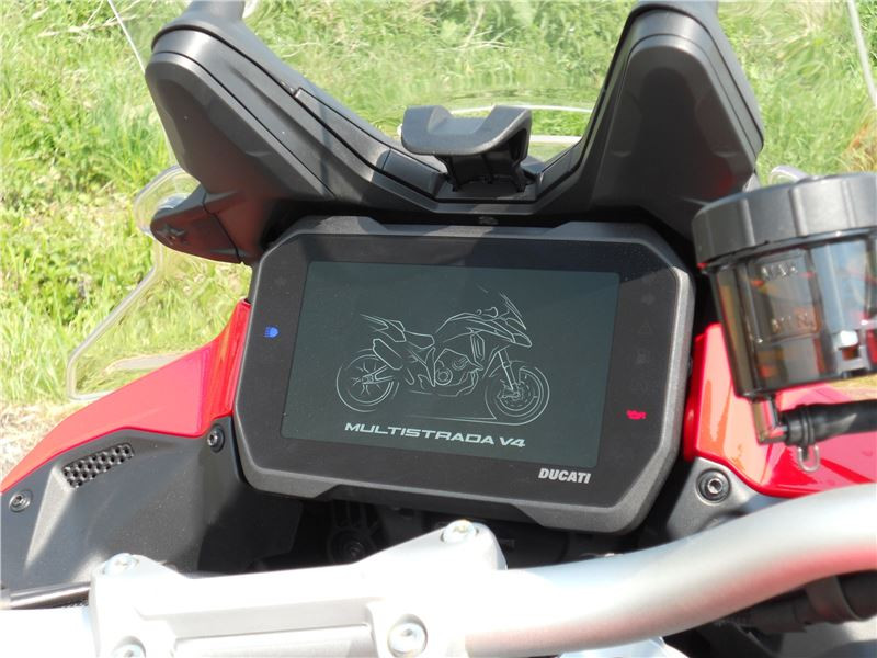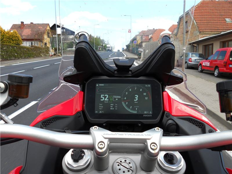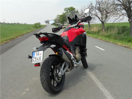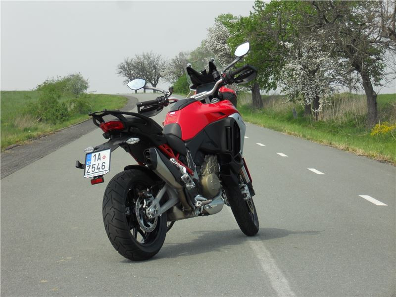 Dost bylo minulosti, před námi je budoucnost V4. Tenhle motor je úžasný. Motorové režimy jsou čtyři a proti zažitým standardům zde není RAIN, ovšem tuším, že tuhle motorku si začátečník zřejmě nepořídí. Všechny nové V4 verze Multistrady mají a budou mít stejný motor, tedy pokud se někde v koutku vývojové kanceláře nešeptá o verzi Pikes Peak, která by zřejmě mohla být divočejší a třeba i se 17“ předním kolem a třeba i s letmáčem. Jen spekulace.