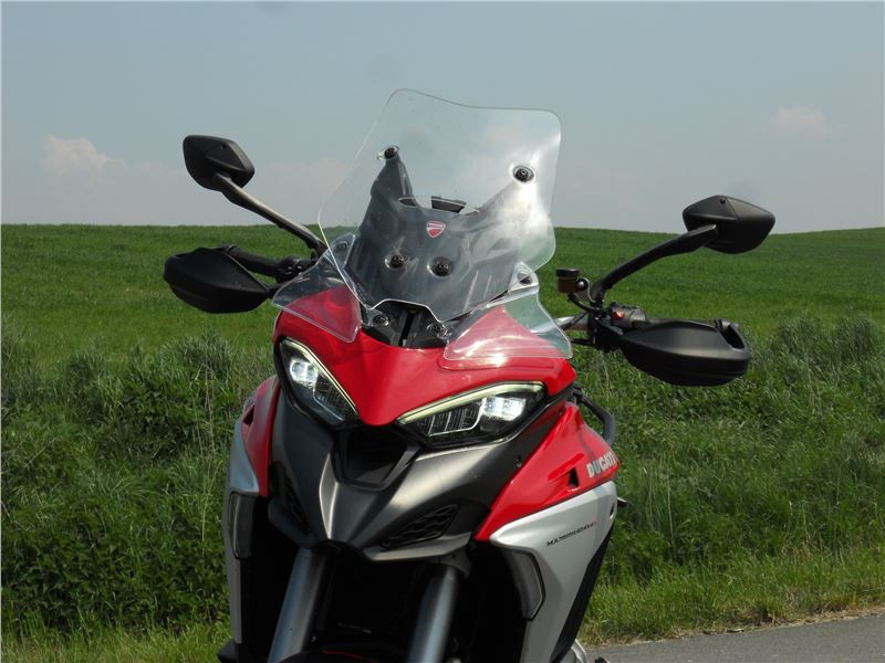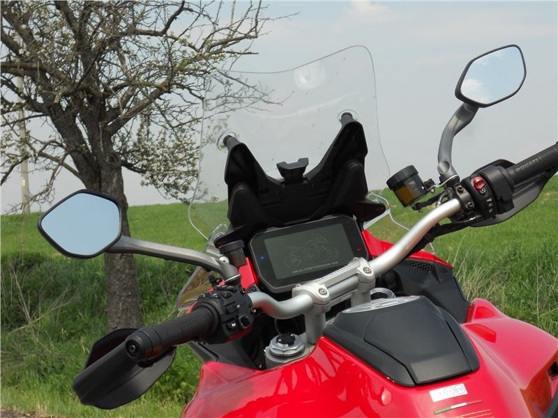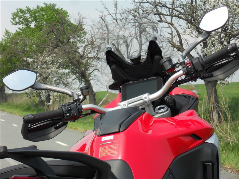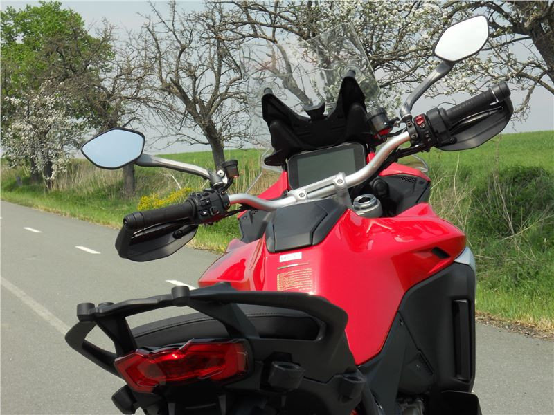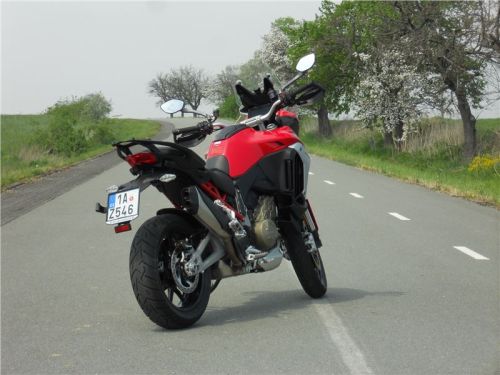 220 mm světlá výška spolu s 19“ předním kolem otevírají mnohem širší možnosti turistiky, než bylo doposud u Multistrady zvykem. Standard byl standard a Enduro endurem, MTS V4 je ideální mix. Výška véčtyřky je tak akorát pro každého, pořád sportovní charakter, ale nové terénní možnosti a rozumná velikost ráfků a pneumatik. Mám svou oblíbenou enduro zkratku kdesi na Pardubicku polem nepolem i lesem a jo, je to fajn. Tady je nová Multistrada úplně v pohodě, ať už na kamínkách, nebo na hlíně a jehličí.