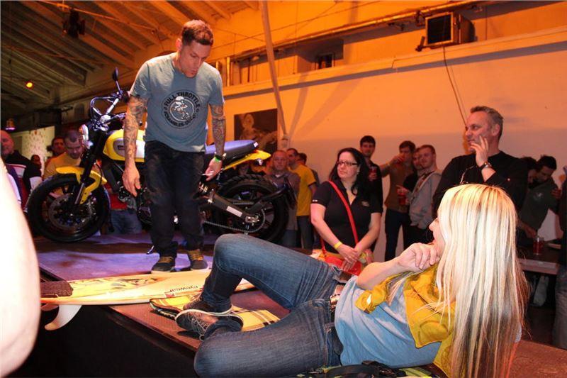 Součásti večera byla také malá módní přehlídka oblečení a doplňků Ducati Scrambler. Přehlídky se zhostili členové Ducati klubu DOG CZ, což byla povedená volba a měla větší úspěch, než kdyby na pódiu vystoupili profíci. Nabídka doplňků, civilního oblečení a oblečení na motorku je široká a případní zájemci se mají na co těšit.