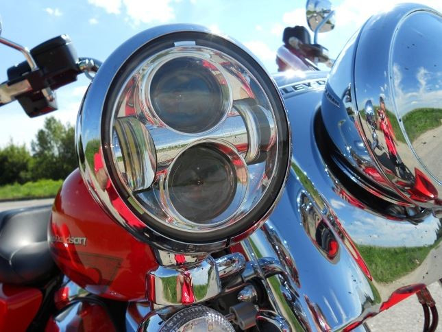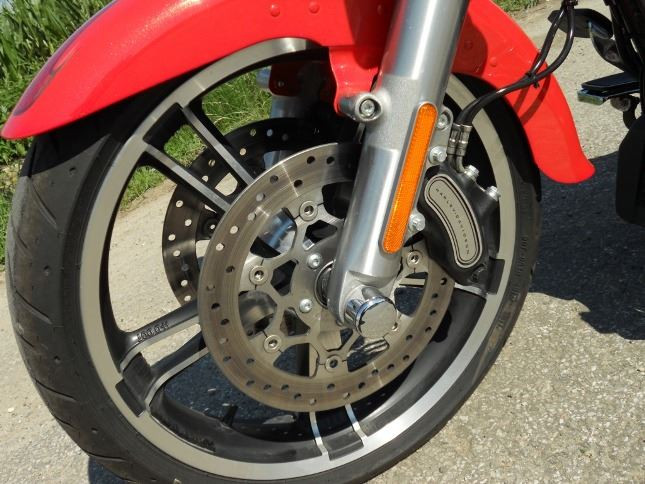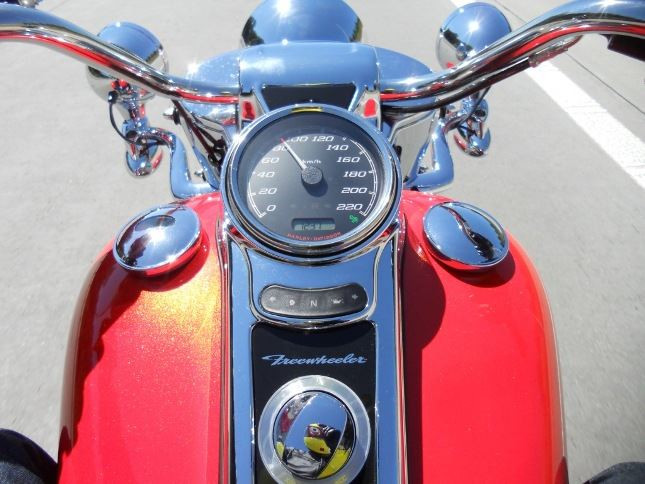 Mohutná přední 49 mm vidlice, mohutné „falešné“ středové světlo, masivní oplechování, opticky štíhlé „sportovní“ 19“ kolo (Tri Glide má MT90B16), zepředu je Freewheeler fakt hustý a cool, jak říká náctiletý soused. Všude hladké linie, žádné ostré tvary, spousta chromu a lesku, výrazné dvojité LED světlomety Daymaker (model 2015 měl jeden klasický halogenový světlomet), dominantní odkrytý motor, všude spousta železa, přesto svěží vzhled. Mohutná záď s uzamykatelným zavazadelníkem, hluboké blatníky, stylové grafické prvky pod lakem a velká hliníková kola s pneumatikami 205/65R15, LED technologie i v zadních světlech. Vše velmi kompaktní a sladěné.