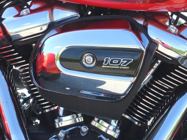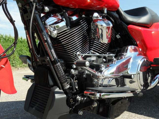Pohonnou jednotkou je nový motor Milwaukee-Eight 107 s objemem 1745 cm3 a pekelným kroutícím momentem 150 Nm při 3250 otáčkách. Zátah je fakt úžasný a na zadní kola jde výkon přes mohutný klínový řemen. Tichý převod, ale burácející dvouválec mě chce vystřelit na Mars. Písty, ač se jen tak volně převalují, za příjemného zvukového doprovodu s výfuků dávají mega sílu. Zvyklý na širší rozsah otáček jiných motorů se nechtěně párkrát dostanu do omezovače. Abych měl mocnou moc, tady stačí tahat málo, objem nenahradíš...
