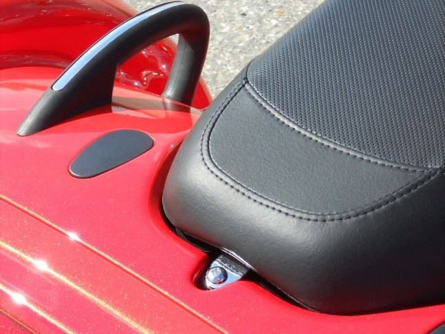 S cestováním souvisí i jízda se spolujezdcem, který řidičovy nadšené pocity nesdílí. Jeho sedadlo je pohodlné, prostorné a příjemné (sám jsem vyzkoušel), ovšem bez opěrky dost nebezpečné. Trochu svižnější rozjezd stáhne spolujezdce na víko zavazadelníku a rychlejší průjezd zatáček natáhne všechny svaly na rukách. Opěrka ve standardu by mohla jízdu rozhodně zpříjemnit, ideálně i s integrovaným bezpečnostním pásem :-) Spolujezdec má mohutná a bezpečná madla, ale nečekaná změna směru mu dokáže hodně zvýšit adrenalin. Jezdili jste někdy na "divokém býkovi"? Při rychlé jízdě je to velmi podobné. Jezdíte jako spolujezdec v autě na zadních sedadlech? Je to v podstatě stejné. Nečekané manévry a změny směru s vámi pěkně zakývou. Opěrku spolujezdce a další příslušenství je možno dokoupit v originálním příslušenství.