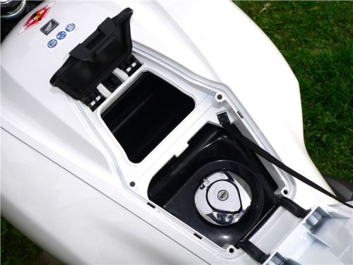 Nicméně abych čtenáře nenudil tím, že nová motorka s výkonem 35 Kw dokáže jet svižně, výborně brzdí (hlavně přední brzda), krásně se vede do zatáček a má malou spotřebu, přidám pár negativ. Pod uzamčeným sedlem jsem, nevím proč, čekal více místa - vejde se sem pouze lékárnička a originální nářadí. Sedlo odemknete zámkem umístěným vedle zadního světla. Nádrž je plastová, takže na ni nelze umístit magnetický tankvak. Po odkrytí plastového krytu na nádrži najdete uzamykatelné hrdlo 12,4 litrové nádrže a velmi malou uzavíratelnou schránku na „něco“.