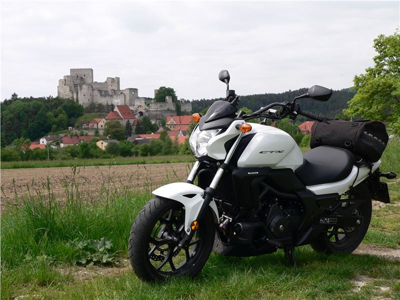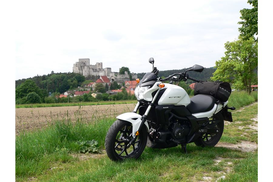 Ke svému údivu jsem se dokázal sbalit na pět dní jen do jednoho textilního válce, který jsem upevnil na CTX za sebe na sedlo spolujezdce. Zpod zadního sedadla vystupují k tomuto účelu dvě očka a dva háčky. Po podepsání přebíracího protokolu a poučení předávacím technikem o funkci automatické převodovky DCT jsem vyrazil na cestu.