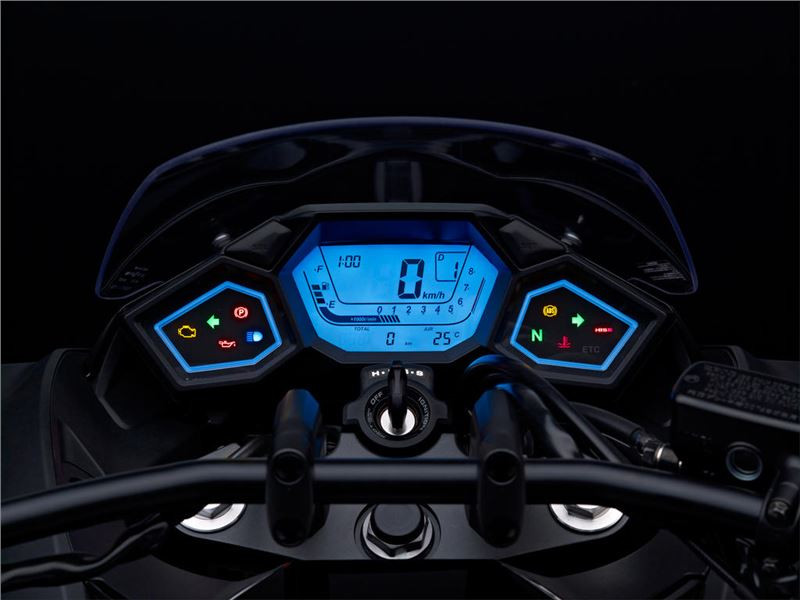 Barvy digitálního přístrojového panelu se mění podle výběru jízdního režimu. Při zařazeném neutrálu svítí bíle, v režimu Drive modře, v režimu Sport růžově a v režimu MT (manuální) nastupuje agresivní červená. Jezdec si též může přizpůsobit displej výběrem barvy z dalších pěti barevných odstínů, díky čemuž má k dispozici celkem 25 různých barev.