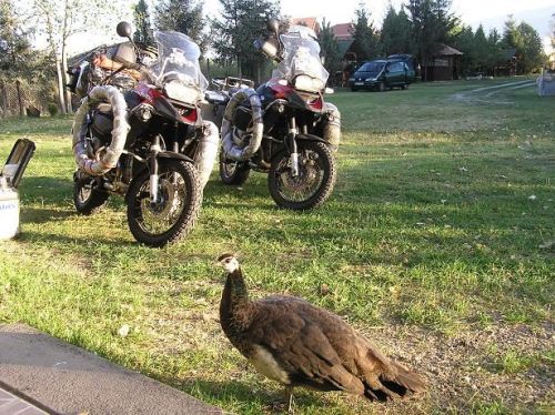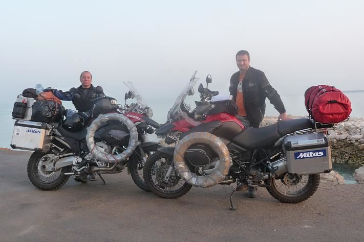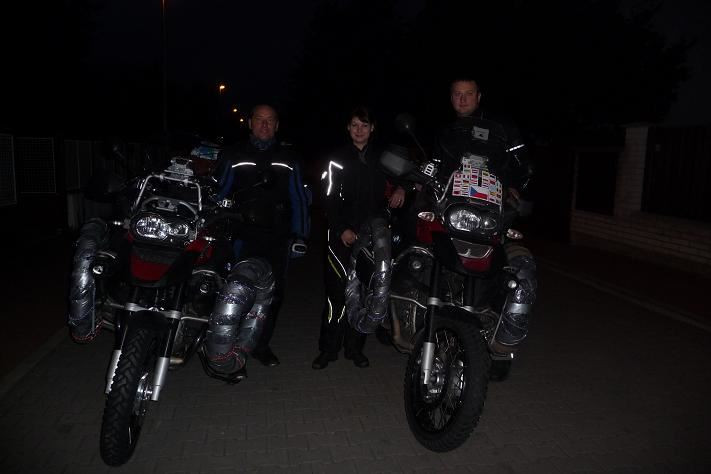 V 6 hodin je tma. Děláme startovní fotku a vyrážíme za dobrodružstvím. Trasu máme namalovanou v Pepině. Dnes chceme urazit co největší porci kilometrů. První zastávku děláme na D1 u Devíti křížů. U držkové polívky si sdělujeme první dojmy z jízdy. Okolo 120 km/hod se motorky nepříjemně rozvlní. Je to asi způsobeno náhradními pneumatikami, které jsou namontovány na bočních padácích. Nad 130 to nedělá, tak volíme vyšší rychlost a závada je odstraněna.
