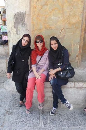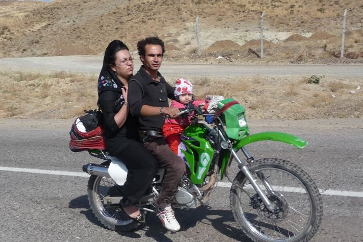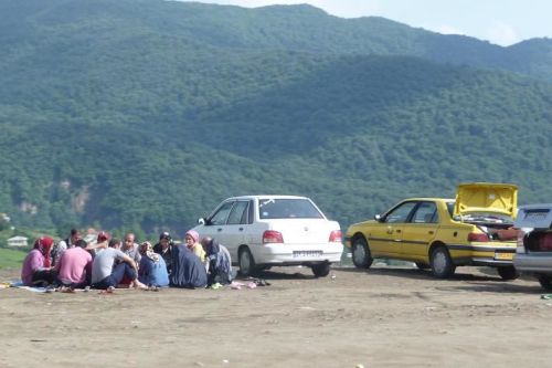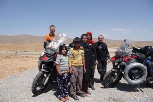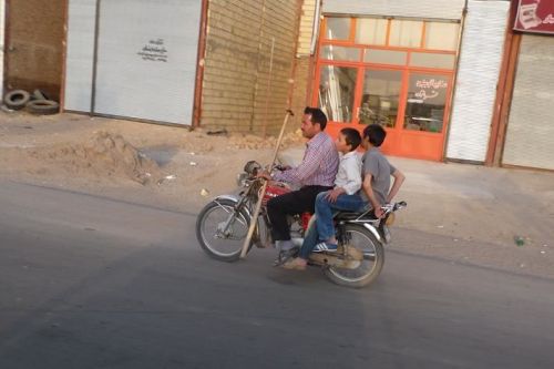Nedaleko nás zastavuje skřípající osobák. Od předních kol se ozývají kovové zvuky, oznamující absenci brzdového obložení. Z auta vystupuje pohledná paní a tři děvčata. Okukují kouřící kola. Jdu jim poradit a dozvídám se, že paní s dcerami jedou do Esfahanu na rodinnou oslavu. Jsme pozváni jako vážení hosté, což s díky odmítám. Nevadí, prý příště. Nad brzdami mávne rukou, za chvíli to prý bude jen po rovině.