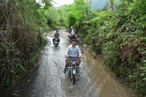 Na začátku vesniček čekají kluci na svých strojích. Když přijedeme, tak nás doprovázejí. Pak někam telefonují. Asi do další vesnice, protože všude na nás takto čekají. Každý si veze svoji holku zahalenou v šátku. To je jediná bezpečnostní ochrana. Všichni jezdí bez helem a brýlí, jen v civilním oblečení a v pantoflích. Mimo vesnici s námi udržují tempo, pak to osolí a mizí v dáli. Motorky musejí mít nějak upravené. Nechceme se nám s nimi závodit, dodržujeme stále stejné tempo.