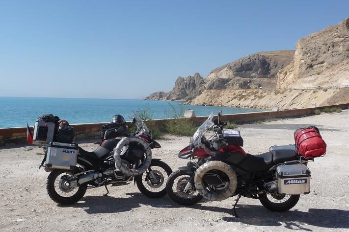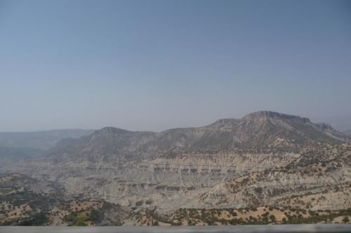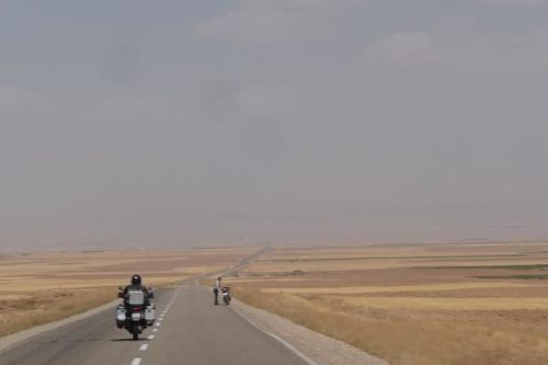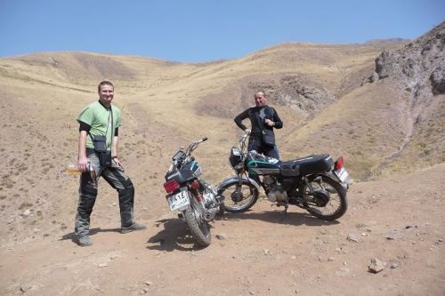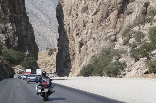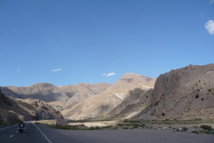 Stoupáme divokou krajinou do výšky 2580 m n.m. Předjíždíme supící kamiony, dýchavičné osobáky a přeložené motorky. Naše stroje sice nejedou na plný výkon, ale proti ostatním jsme závodníci. Touto pustinou pojedeme asi 250 km. Nekonečné obzory, kde není opravdu nic jen písek a kamení. V dáli jsou vidět vrcholky nejvyšších hor tohoto pohoří Kuh-e Dinar 4404 m n.m. a Kuh-e Alijuq 3746 m n.m.