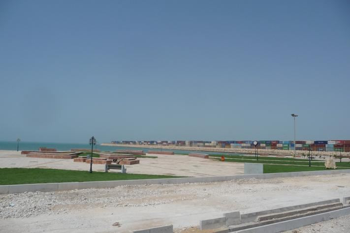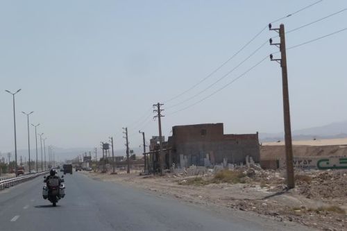 Jedeme po obrovské pláni. Okolí je porostlé uschlou trávou. Míjíme vojenské základny a v dálce jsou vidět obrysy budov ukrytých v poušti. Konečně zdoláváme těch 170 km a vjíždíme do přístavního města Bandar-e Bushehr.