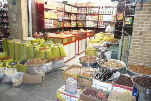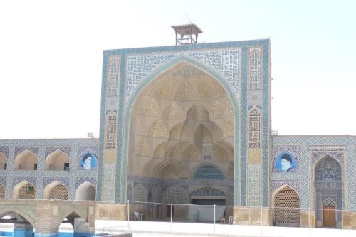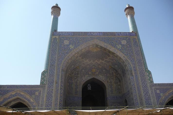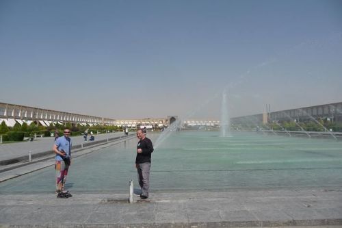 Poloha našeho hotelu je opravdu vynikající. Po 10 minutách vcházíme na centrální náměstí Mejdún-e Emám Chomejní. Procházíme se podloubím Velkého bazaru. Zde se nabízí pouze zboží pro turisty, kterých potkáváme opravdu mnoho. Někteří prodejci umějí i několik slov česky. Do obrovské dominantní Šáhovy mešity pouze nahlížíme. Je doba večerní motlitby a my nechceme vyrušovat. V podloubí je krásná perská restaurace. Objednáváme si kuřecí maso a rýži. Bez ptaní dostáváme polévku, něco jako hrachovku. Je trochu ostrá, ale výborná. Nabízejí nám nějaké specielní moučníky, ale nemáme na to odvahu.