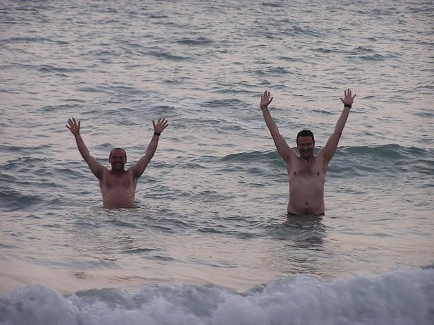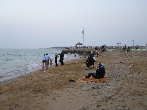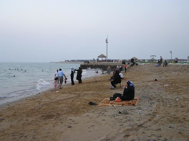 V 19 hodin, když slunce mizí za obzorem, nás veze hotelové taxi k moři. Utěšujeme se, že u vody bude příjemně. Ale ouha, vzduch má stále 42 stupňů a obrovská vlhkost nám lepí oblečení na tělo. Od moře to fičí vařící. Tak alespoň ta voda, to bude osvěžení. Na malé plážičce jdeme do trenek, což se smí. No tedy muži jo. Ženy sedí ve svých úborech na dekách a dívají se, jak se my, páni tvorstva, koupeme. Nebo se mohou svlažit také, ale oblečené.