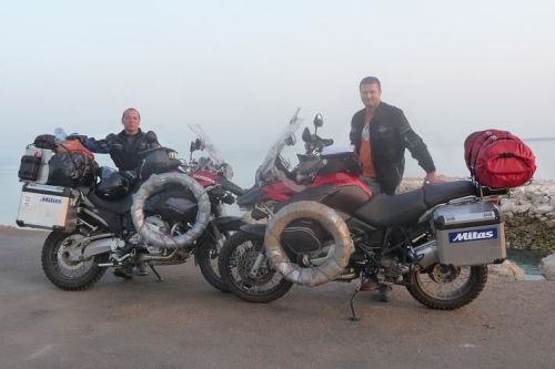 Večer se scházíme u nás doma. Motorky mají obuté nové pneu Mitas E-07, já klasickou verzi a Roman E-07 Dakar. Ty jsme obdrželi od Firmy Mitas, abychom je otestovali na našich těžkých strojích. Monika nám servíruje rozlučkovou večeři. Pak popíjíme čaj a kontrolujeme, zda máme opravdu vše.