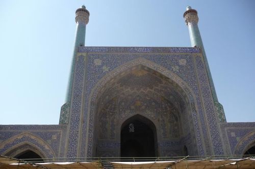 Je tady asi nějaký moto sraz? Né, to je pouze parkoviště. Za poplatek 5 Kč vstupujeme do Šáhovy mešity (Masdžed-e Emám Chomejní). Je opravdu obrovská. Klenby jsou vysoké 30 m a celá stavba je obložena modrou mozaikou. To musela být piplačka... Minarety se tyčí majestátně k obloze. Uvnitř jsou obrovské prostory a nádherná ozvěna. Srolované koberce v rozích čekají na večerní motlitbu.