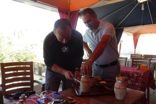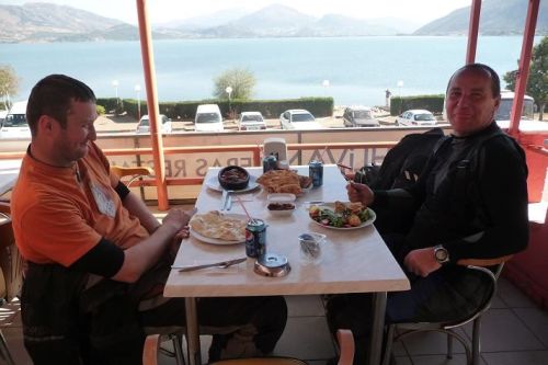 V poledne stavíme na parkovišti pro náklaďáky a jdeme do místní jídelny. Dáváme si dušené jehněčí se zeleninou a rýži. Samozřejmě oběd zakončujeme silným čajem. Také zjišťujeme, že turecky čaj se řekne čaj.