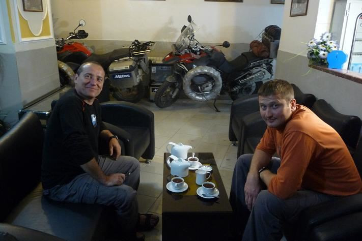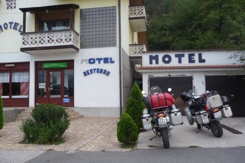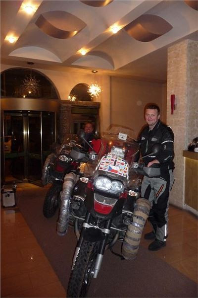 V centru nacházíme hotel Kral. Pan recepční je divný. Tvrdí, že má pouze dvou a jednolůžkové pokoje. No dobrá, hlavně, že si můžeme zaparkovat naše stroje ve vstupní hale. Boční dveře jsou dost úzké, ale nakonec se nám daří dostat motorky dovnitř.