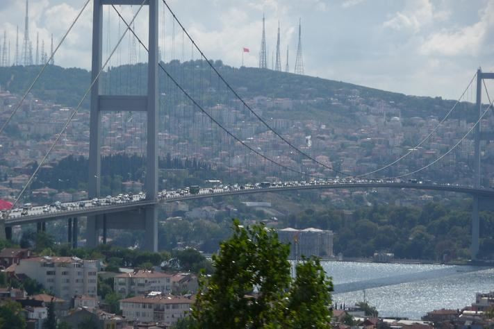V 11 startujeme. Provoz není tak strašný, jak nám všichni říkali. Po půl hodince vjíždíme na most dělící Evropu od Asie.