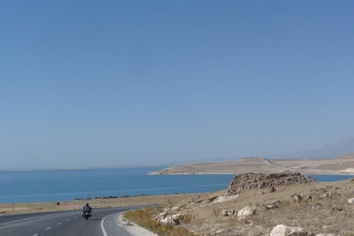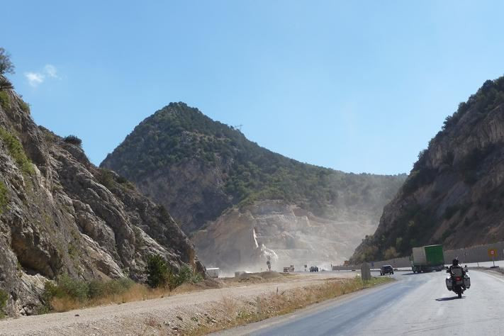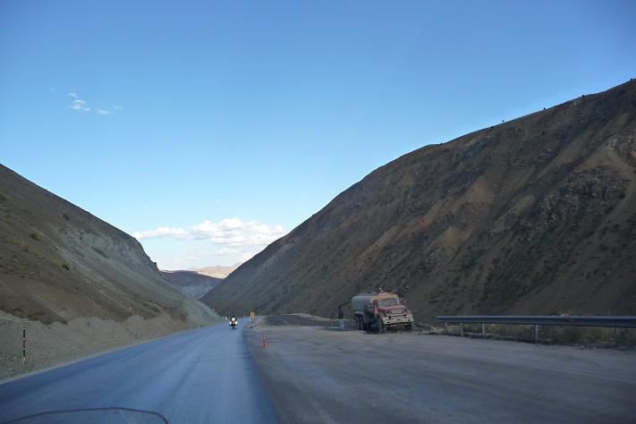 Stále jedeme po náhorní planině, okolo jsou skály. V jednom místě dělají novou silnici. Je to zajímavé. Nalijí horký asfalt a okamžitě do toho sypou velkou vrstvu ostrého štěrku. Po takovéto nové silnici jedeme. Kameny odstřelují a přední kolo tancuje, ale pravidlo neubrat plyn se ukazuje jako dobrá volba. Snažíme se jet do 110 km/hod.