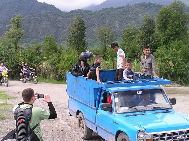 Po kroucené silnici pomalu klesáme ke Kaspickému moři. Sjezd je dlouhý 60 km. Míjíme veliká parkoviště, kde jsou tržiště a občerstvení. U silnice se griluje kukuřice a maso. Všude postávají děti a prodávají čerstvě natrhané ovoce. Auta jedou v koloně, ale jak nás zahlédnou v zrcátku, tak se snaží nám uhnout. Poté za námi vyrazí a snaží se nás dohnat a vyfotit.