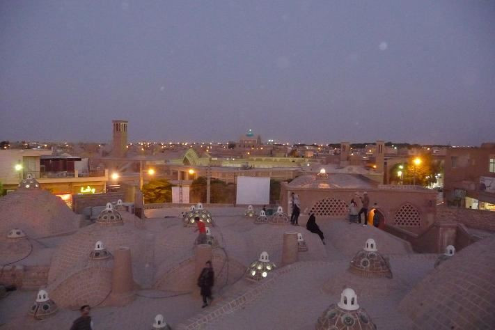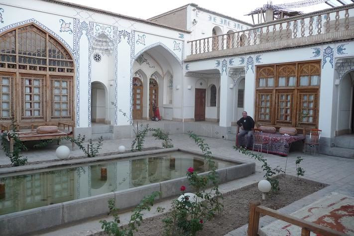Hurá, v dáli se objevuje náš dnešní cíl, město Kashan. Přijíždíme v 15 hodin v tom největším vedru. Většina obchodů je zavřená a obyvatelé jsou poschováváni někde ve stínu. Opět chvíli bloudíme, ale nakonec nacházíme náš vytipovaný hotel Sayyah. Mají vlastní dvůr, kde parkujeme a jdeme se ochladit do našeho pokoje.