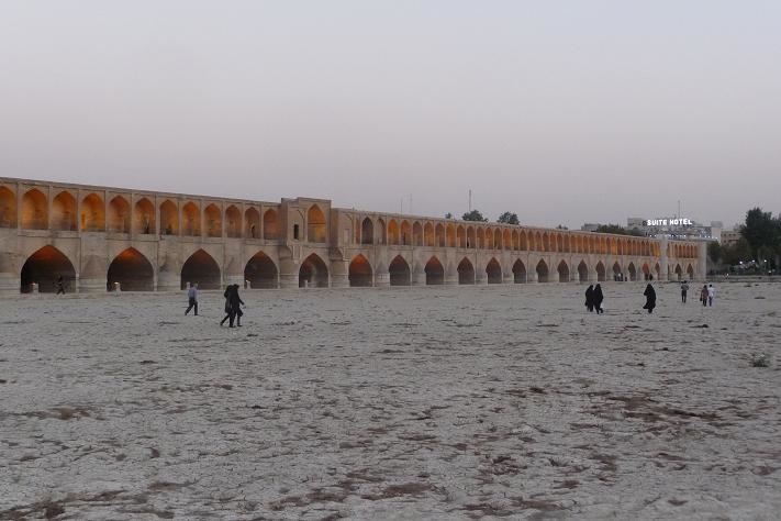 V recepci si objednáváme taxi, cena je už předem domluvena. Po chvíli přijíždí kamarád slečny v recepci v soukromém voze. Veze nás za 40 Kč k vyschlé řece Zájende. Obdivujeme nádherný středověký terasovitý most Sí vo Sé Pol (Most 33 sloupů).