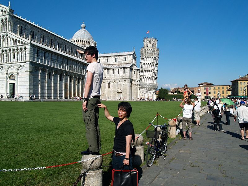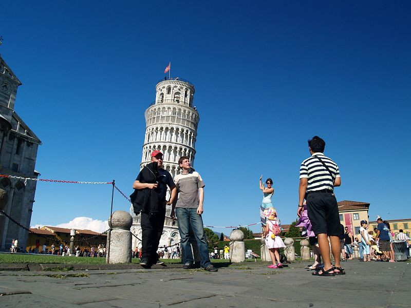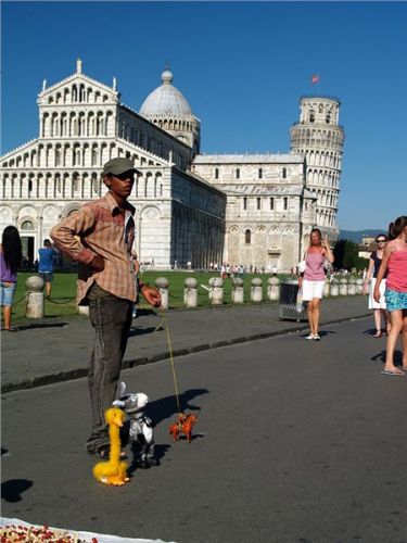 Ve Viareggiu vzdáváme trasu po Via Appia a odbočujeme na neplacenou dálnici směrem na Pisu. V Pise je dohromady lidově řečeno prd. Někdo tu špatně postavil věž, ještě teď je na ní lešení a minimálně dvacet japonců se tu v jakoukoli dobu snaží vyfotit, jak ji podpírají. Dav turistů se hrne kolem desítek stánků nabízejících tisíce přívěsků, odznáčků, čepic, triček a kdesi čehosi, přičemž na všechno vystavené zboží pochopitelně šikovný čínan nějakým způsobem přidal slovo Pisa nebo minimálně Italia. Čistě jako důkazní materiál pořizujeme společnou fotografii, míjíme pouliční dealery pravých Breitlingů a slunečních brýlí cestou zpět k parkovišti.